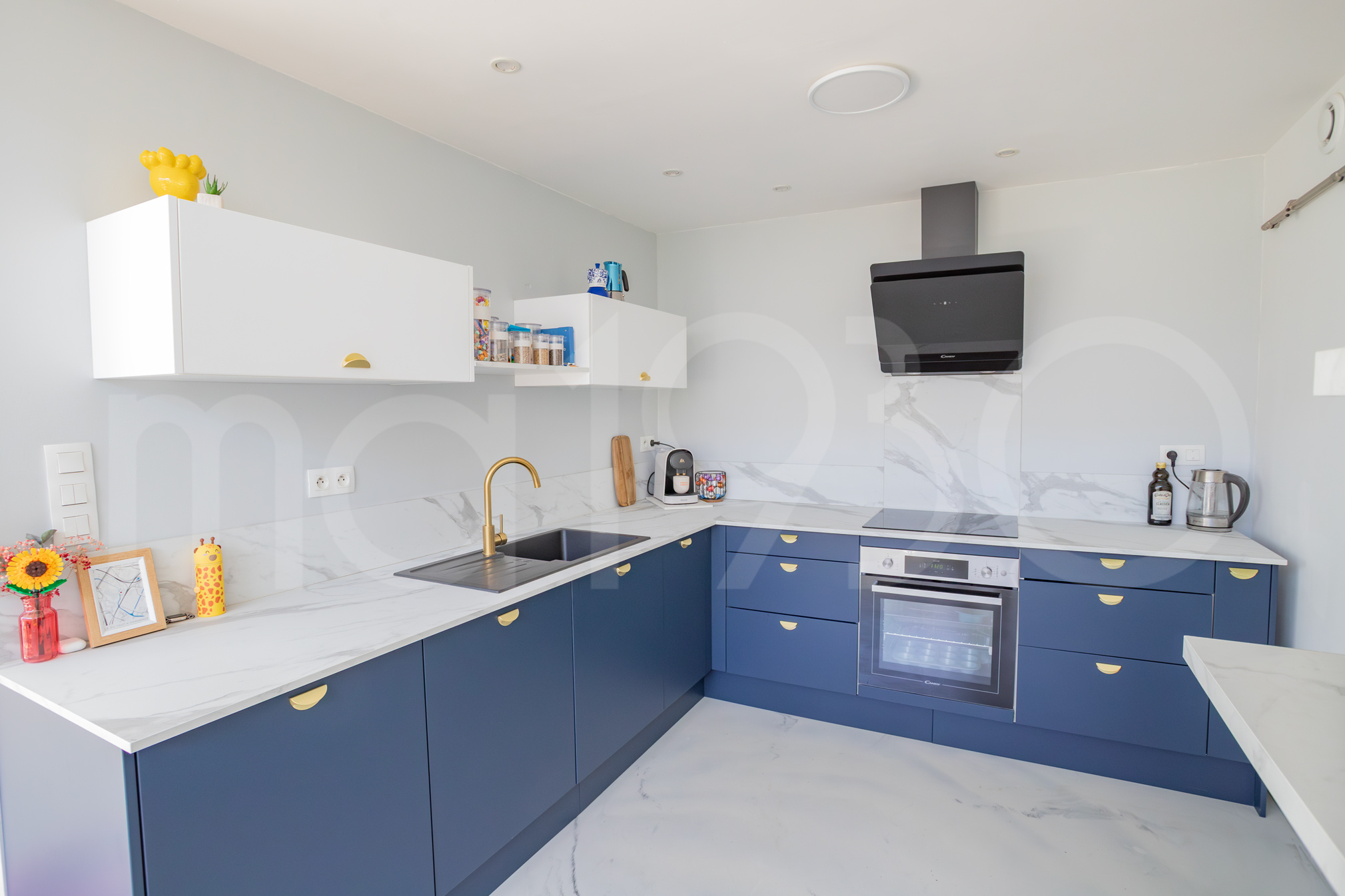 La cuisine est complète est très récente et elle dispose, derrière une porte coulissante, d’un cellier où trouverez notamment du stockage et les attentes machine.