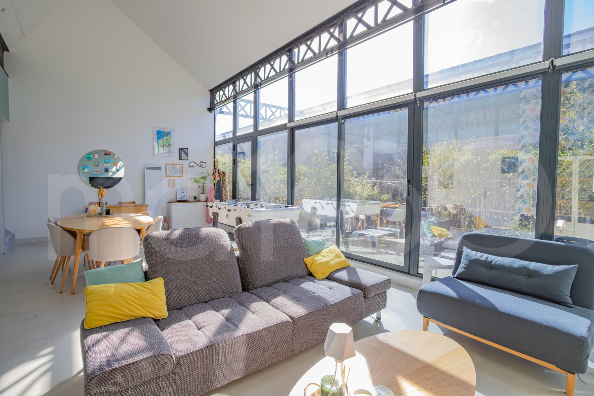 Après avoir traversé une partie de la résidence via notamment une jolie coursive centrale, vous traverserez votre terrasse plein-sud avant d’entrer chez vous. Ici le soleil sera votre coloc’! La lumière est juste dingue grâce aux immenses baies vitrées! Mais si vous trouvez que c’est trop, la propriétaire a fait poser des stores électriques du côté du salon. La pièce de vie mesure près de de 50m2.