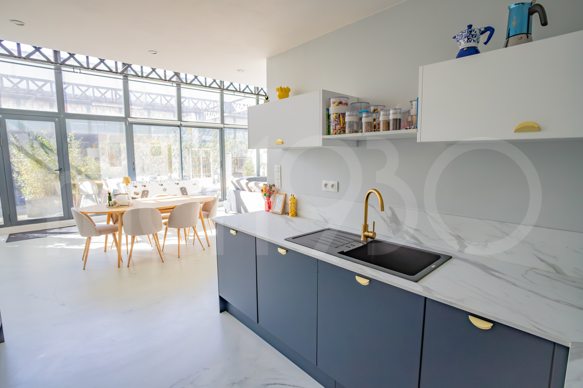 Au moment de l’acquisition, une résine epoxy avec un très léger effet « marbre » a été posé sur l’intégralité du rez-de-chaussée. Résultat : aucun seuil entre les pièces, grande facilité de nettoyage et rendu comme aucun autre loft.