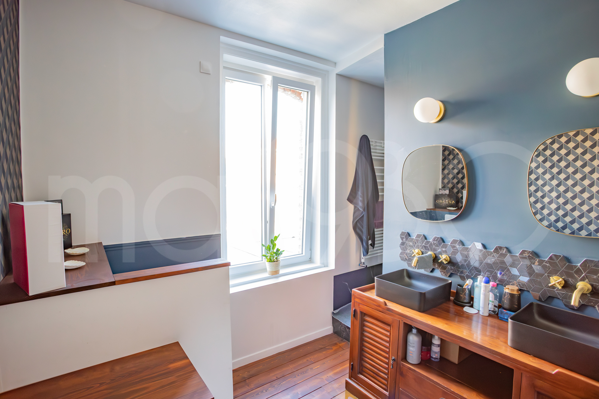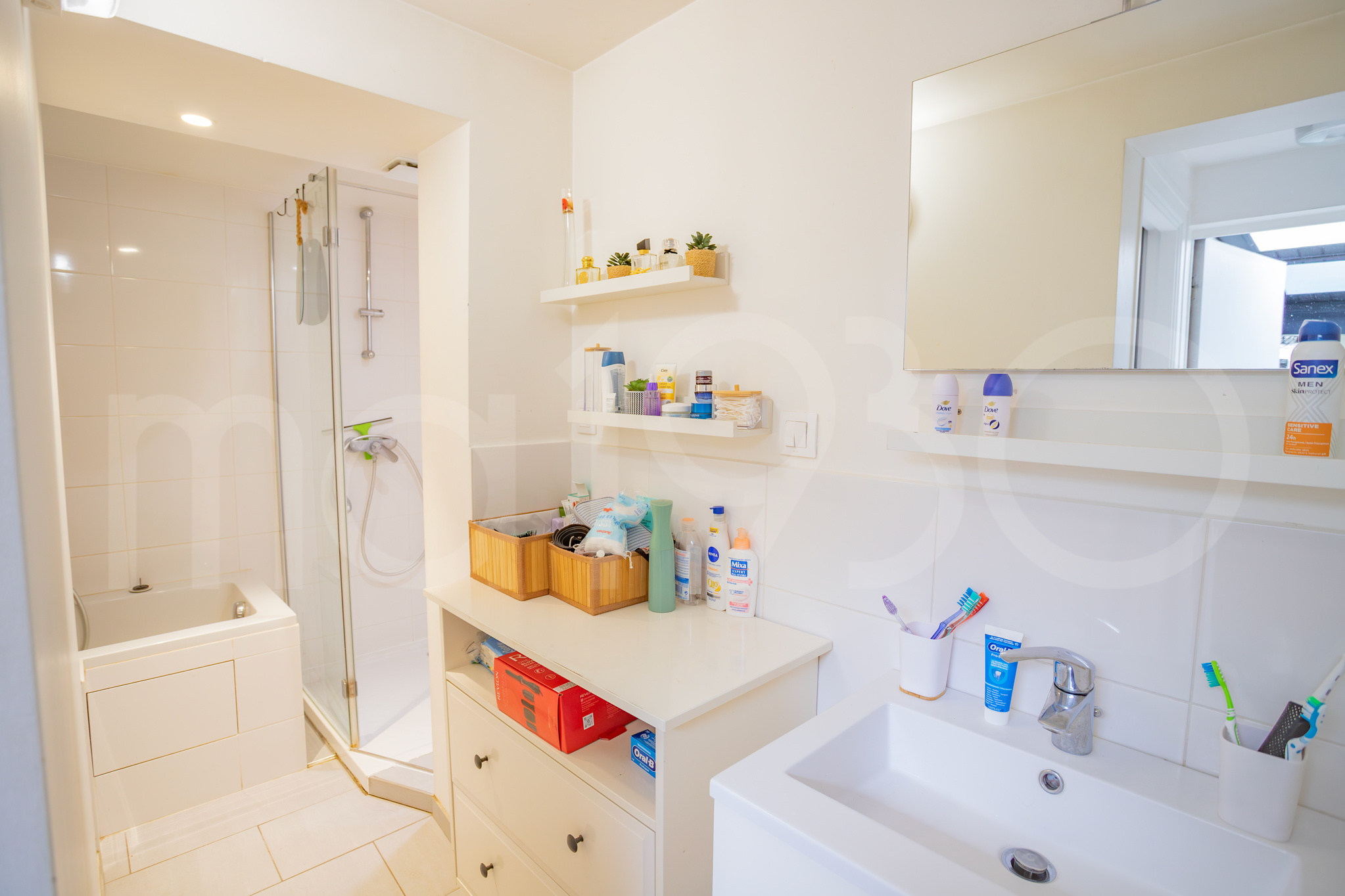 – à l’arrière, la seconde pièce d’eau et qui comprend: double vasque, WC suspendu et une IMMEEEEEEEENSE douche. Tout est en parfait état et la fenêtre vient d’être remplacée