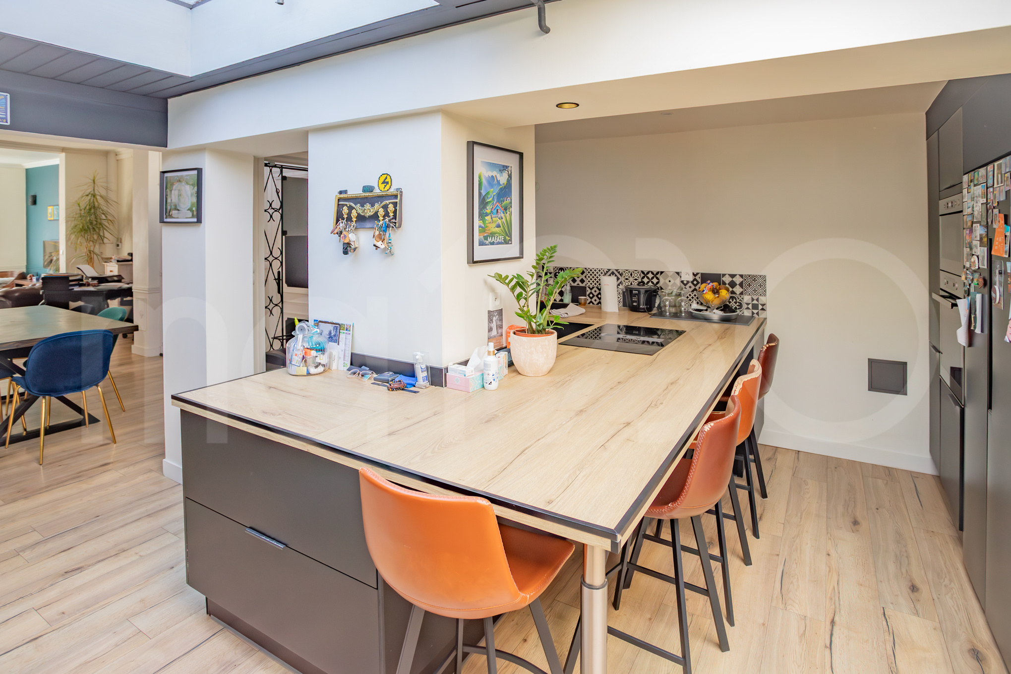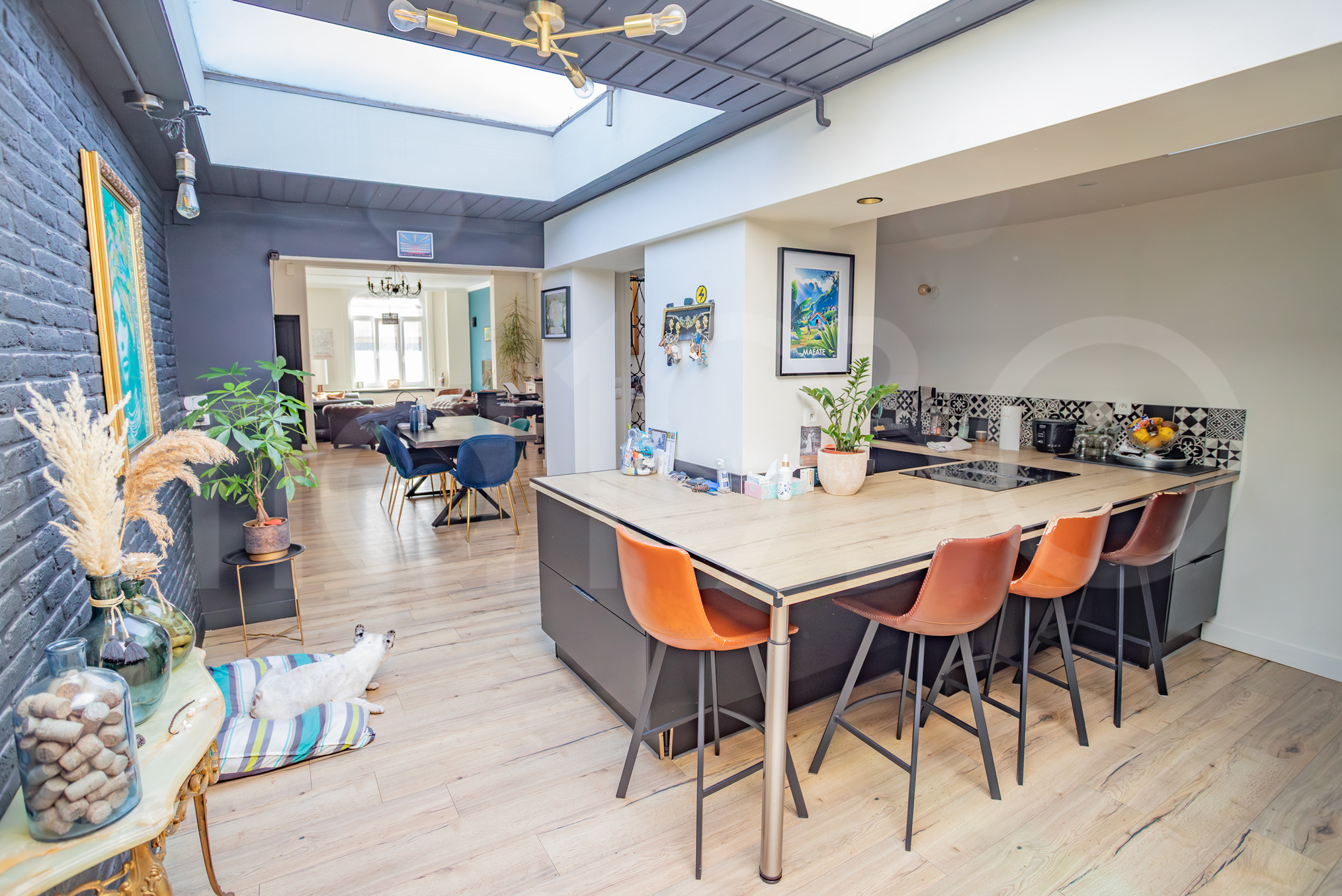 Un couloir typique nous amène directement dans la grande pièce de vie. L’ensemble d’une cinquantaine de m2 dispose d’une belle lumière, d’un parquet. Les menuiseries sont en PVC double vitrage. La cuisine en enfilade est très récente. Toute la partie arrière est lumineuse grâce aux puits de lumière. Ensuite deux portes : l’accès à la salle de bain avec douche et baignoire puis l’accès à la dépendance et les parties techniques de la maison (buanderie notamment).