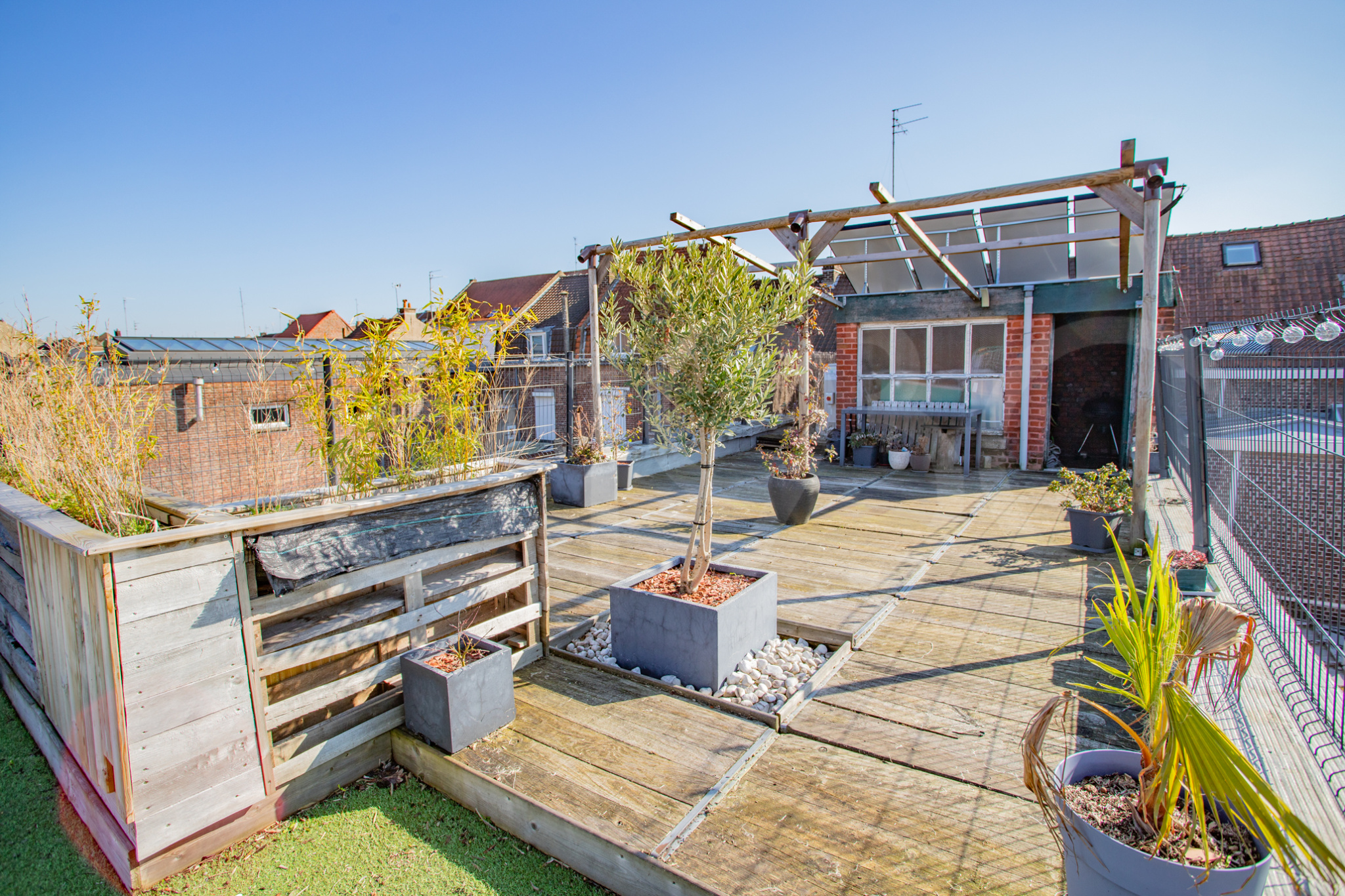 Puis vient le graal, un beau rooftop de 60m2. Ici c’est soleil du matin au soir! L’installation de 4 panneaux photothermiques pour l’eau chaude était une évidence.