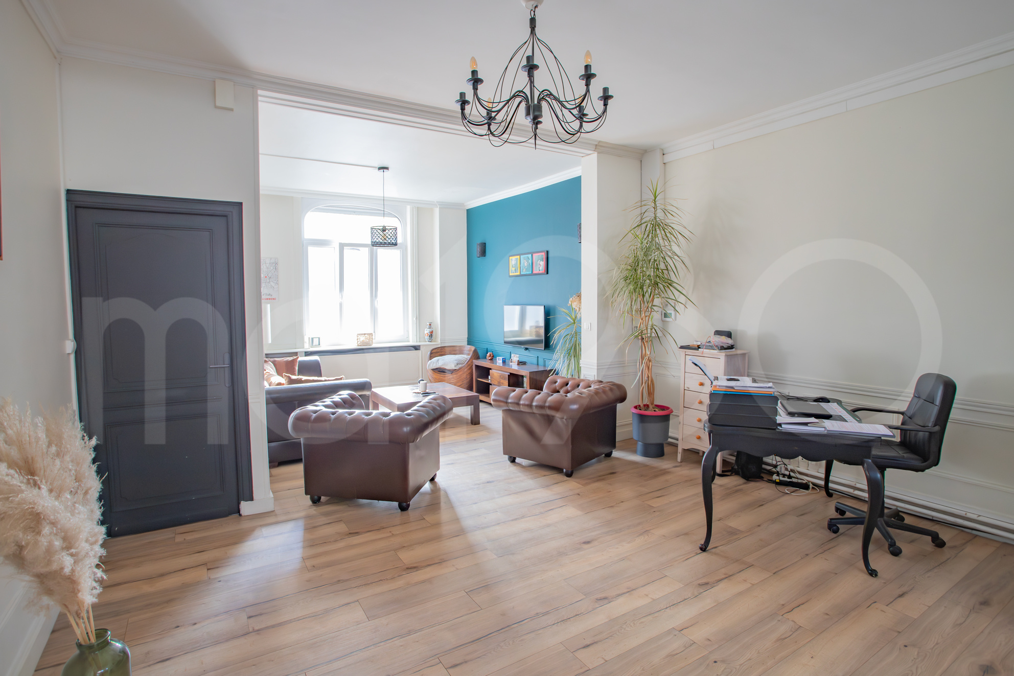 – à l’avant une première chambre, parentale, de 16m2 avec espace dressing dissimulé sous l’escalier. Un parquet d’origine est présent tout comme des fenêtres en PVC double vitrage.