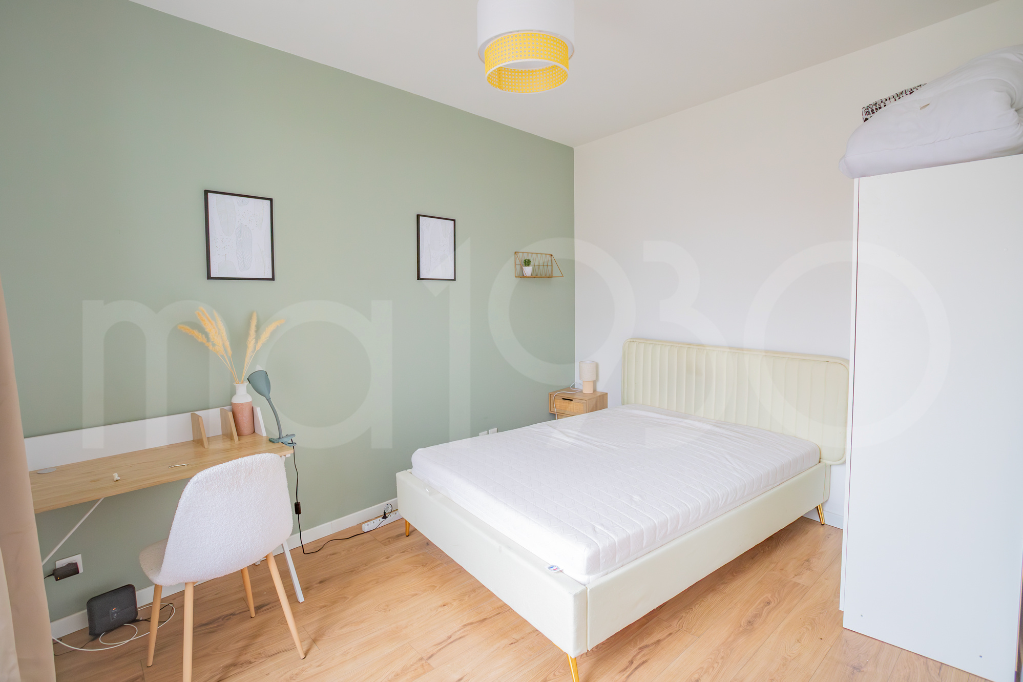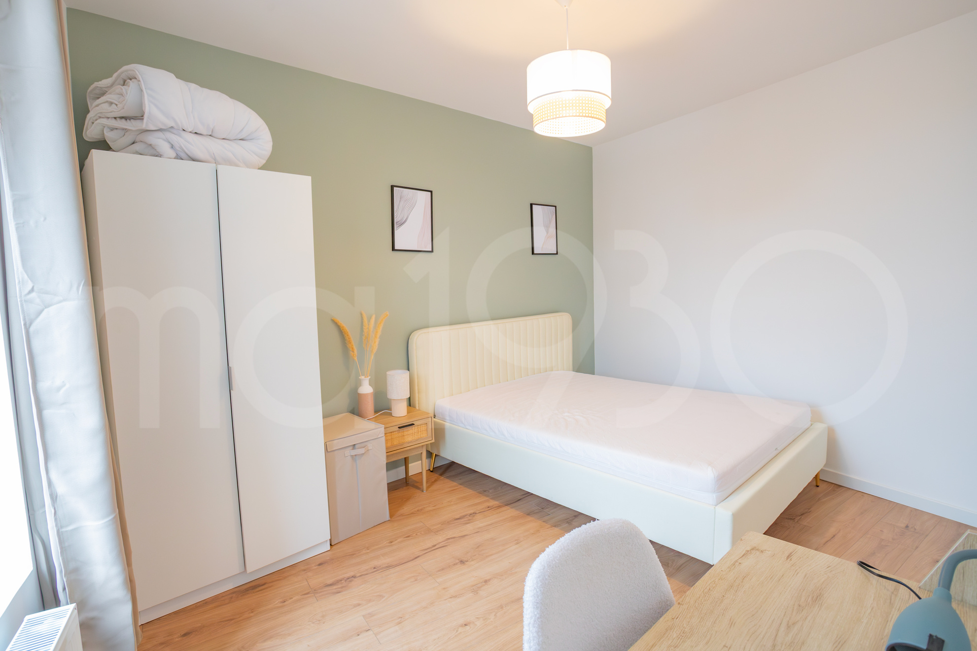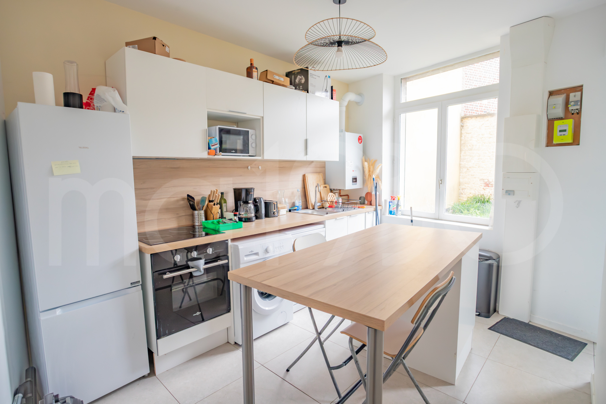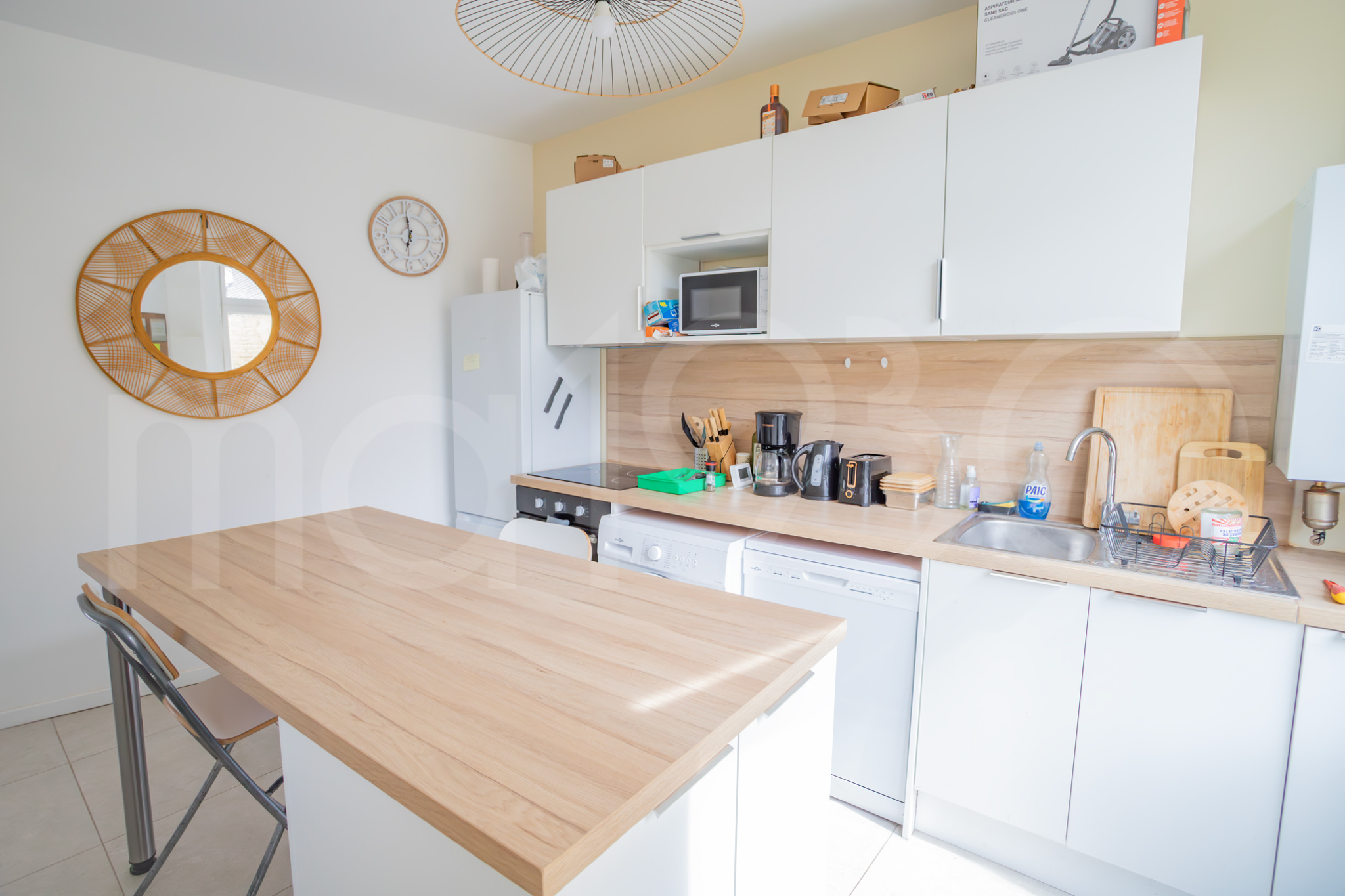 Une fois la porte franchie, à gauche une première chambre de 12m2 environ (vous ne la verrez pas en photo) et à droite la jolie cuisine très lumineuse. Elle est équipée et dispose d’un grand îlot central. Cette première chambre peut parfaitement redevenir une pièce de vie, soit une salle à manger ou un salon. Le propriétaire, investisseur, a souhaité proposer 4 chambres en location.